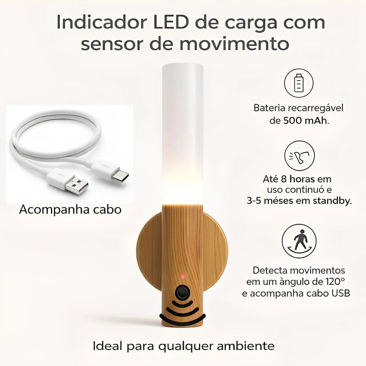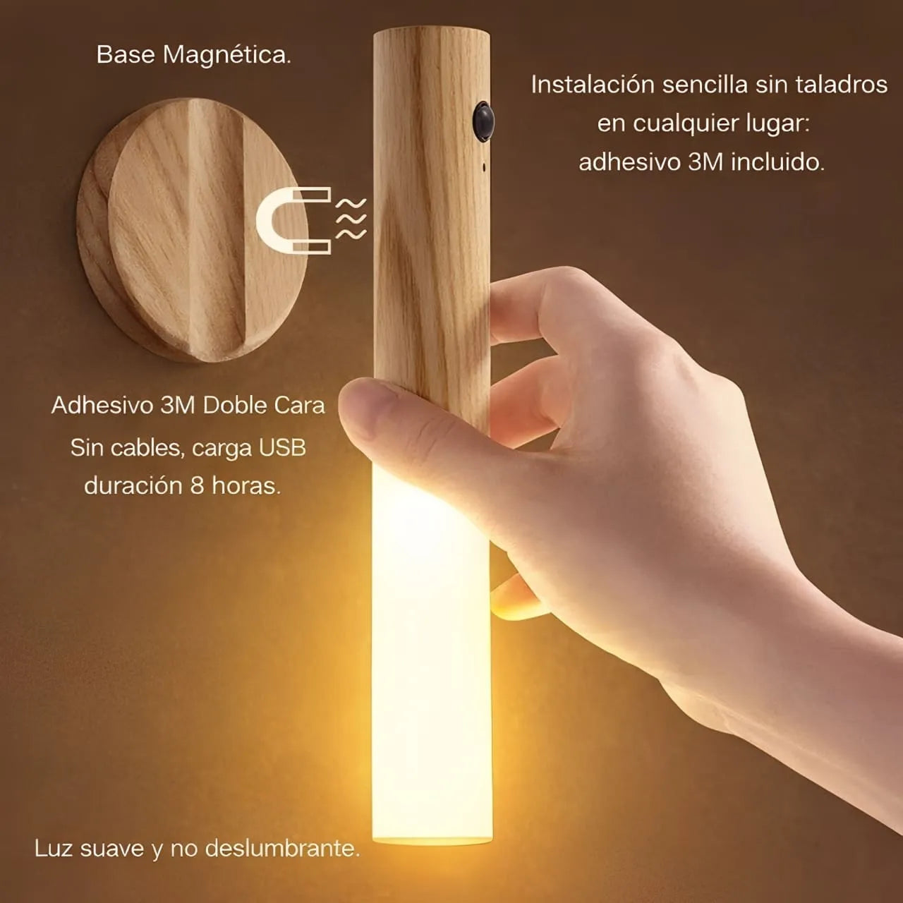 Con sensor de movimiento, recarga USB y diseño elegante en madera. Ideal para cualquier espacio.
